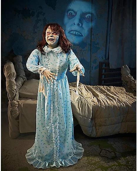 The Regan animatronic is sure to make any fan of the horror movie The Exorcist jump. With disturbing head-spinning movements just like in the movie and actual voice lines from the film, this Regan animatronic is the real deal. Standing at five feet tall, your guests will be so impressed with how scary your animatronic display is when they see the spooky light-up image of the demon she’s possessed by projects from the Regan’s back.