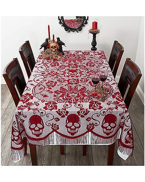 Add some flair to your Halloween feast with this hauntingly beautiful gothic tablecloth! This white tablecloth, available exclusively at Spirit Halloween, is patterned with red skulls and roses, making it the perfect combination of elegant and eerie.