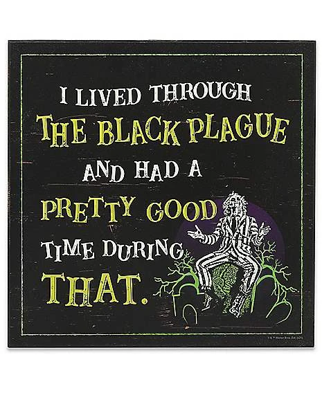 Show off your movie fandom with this Black Plague Beetlejuice Sign! This black sign features a quote from Beetlejuice reading “I lived through the black plague and had a pretty good time during that” along with an image of Beetlejuice in his striped suit. Hang it anywhere in your home so you’ll always have something from your favorite film to smile about.