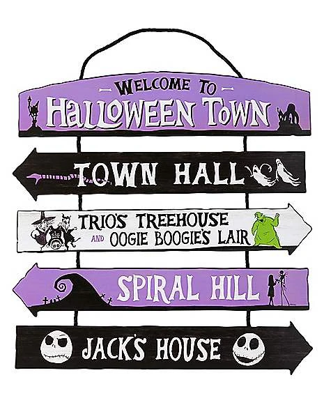 Celebrate Halloween all year long when you hang up this officially licensed Halloween Town Ladder Sign in your home. This sign points you in the direction of some of the coolest places in Halloween Town, including town hall, Oogie Boogie’s lair, Spiral Hill, and Jack Skellington’s house!